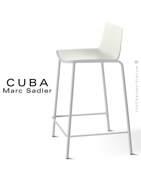 Tabouret de cuisine design CUBA, assise coque plastique couleur blanc pur, structure acier peint aluminium.