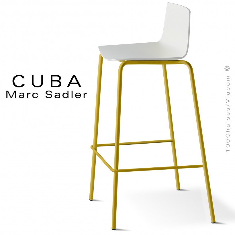 Tabouret design CUBA-ECO, assise coque plastique couleur blanc, structure acier peint jaune curry.