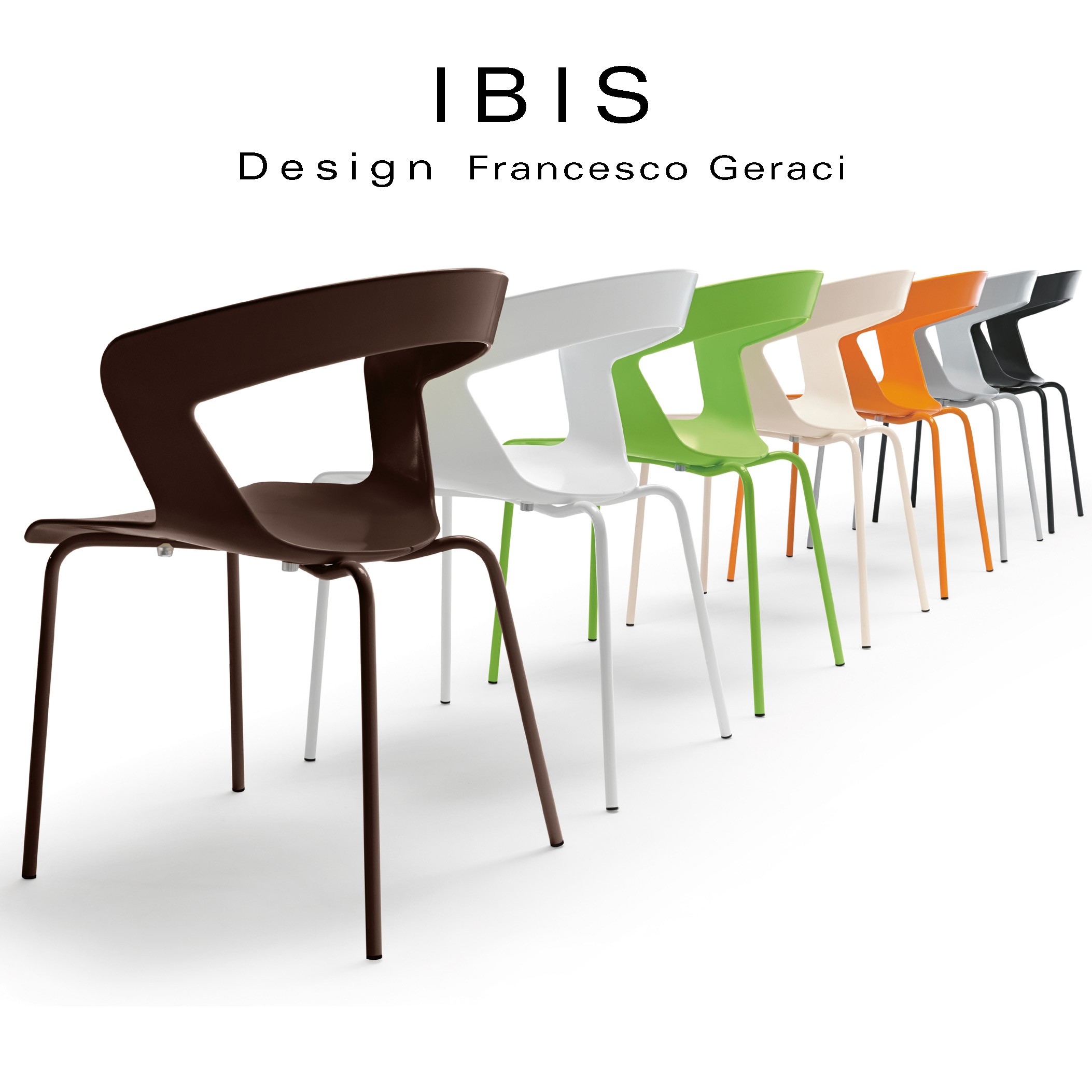 Chaise design IBIS assise coque plastique monobloc (techno-polymère) teinté dans la masse, couleur, anthracite, blanche, gris, gris Tourterelle, ivoire, orange, verte voir palette au choix. Piétement 4 pieds en tube d'acier Ø16 mm., finition chromé brillant ou peint, noir, blanc, anthracite, marron (ou autre couleur sur demande voir palette peinture piétement) avec bouchons plastique de protection des sols. Convient essentiellement pour l'intérieur, mobilier empilable. En option coussin feutre amovible couleurs anthracite ou sable - Lot de 4 pièces.