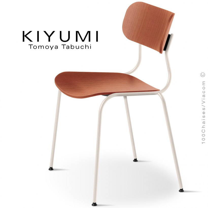 Chaise KIYUMI-WOOD, pour restaurant, café, bar ou maison. Structure 4 pieds en acier peint, chromé, ou laiton et or brillant. Coussinets de protection du sol. Assise et dossier en contreplaqué de frêne cintré. Ensemble de quatre pièces. Veuillez noter que les couleurs affichées numériquement peuvent différer légèrement du produit réel. Pour les couleurs spéciales telles que l'or et le laiton, veuillez contacter commandes@100chaises.fr