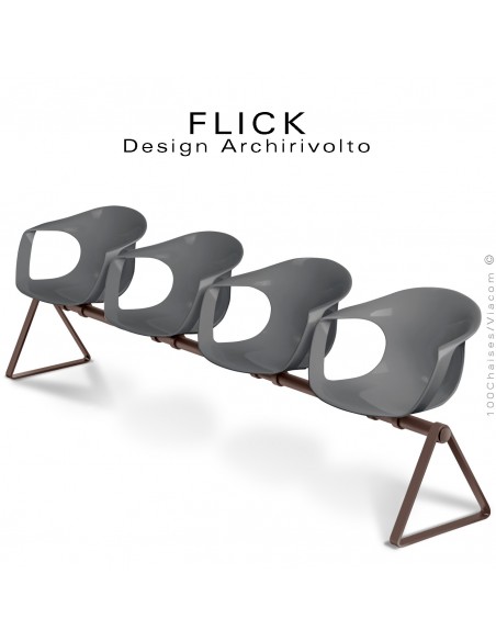 Banc design FLICK, assise 4 places ou sièges sur poutre pour salle d'attente, structure piétement triangle d'acier en fer plat 40x10 mm., poutre de soutien tube Ø50 mm., finition peinture gris-argent, blanc, noir ou marron (autre voir palette finition piétement). Avec tampons plastiques de protections des sols. Assise coque plastique en Restylon de couleurs blanche, anthracite, vert pomme et gris taupe avec accoudoirs. Option coussins d'assises gamme tissu Alcantara, du fabricant MERCIS, composition 48% PL, 52% COT, de couleurs noir ou marron terre (autre voir palette tissu). Mélange ou patckwork de couleur assise possible vos demandes commandes@100chaises.fr