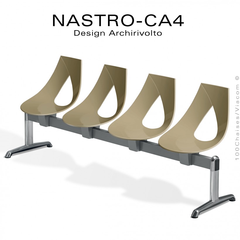 Normes européennesBanc design NASTRO-CA4 ou siège sur poutre pour salle d'attente, assise coque plastique "Restylon" de couleur noir, blanc, taupe, anthracite, vert pomme ou violet. Possibilité de patchwork des couleurs d'assise (mélange) info à commandes@100chaises.fr ou sur l'espace "message" lors de votre commande. Structure poutre de soutien tube d'acier 80x40 mm. finition peinture polyester gris foncé en standard réf.: 3032 MAT, ou autre voir palette peinture fabricant ou dans la gamme RAL. Piétement type "T" en aluminium poli brillant. Avec tampons plastiques de protection des sols. Livré assise démonté avec visseries (option possible sur demande coussin d'assise, cuir synthétique, tissu tissé, velours, feutre etc…) votre demande à commandes@100chaises.fr