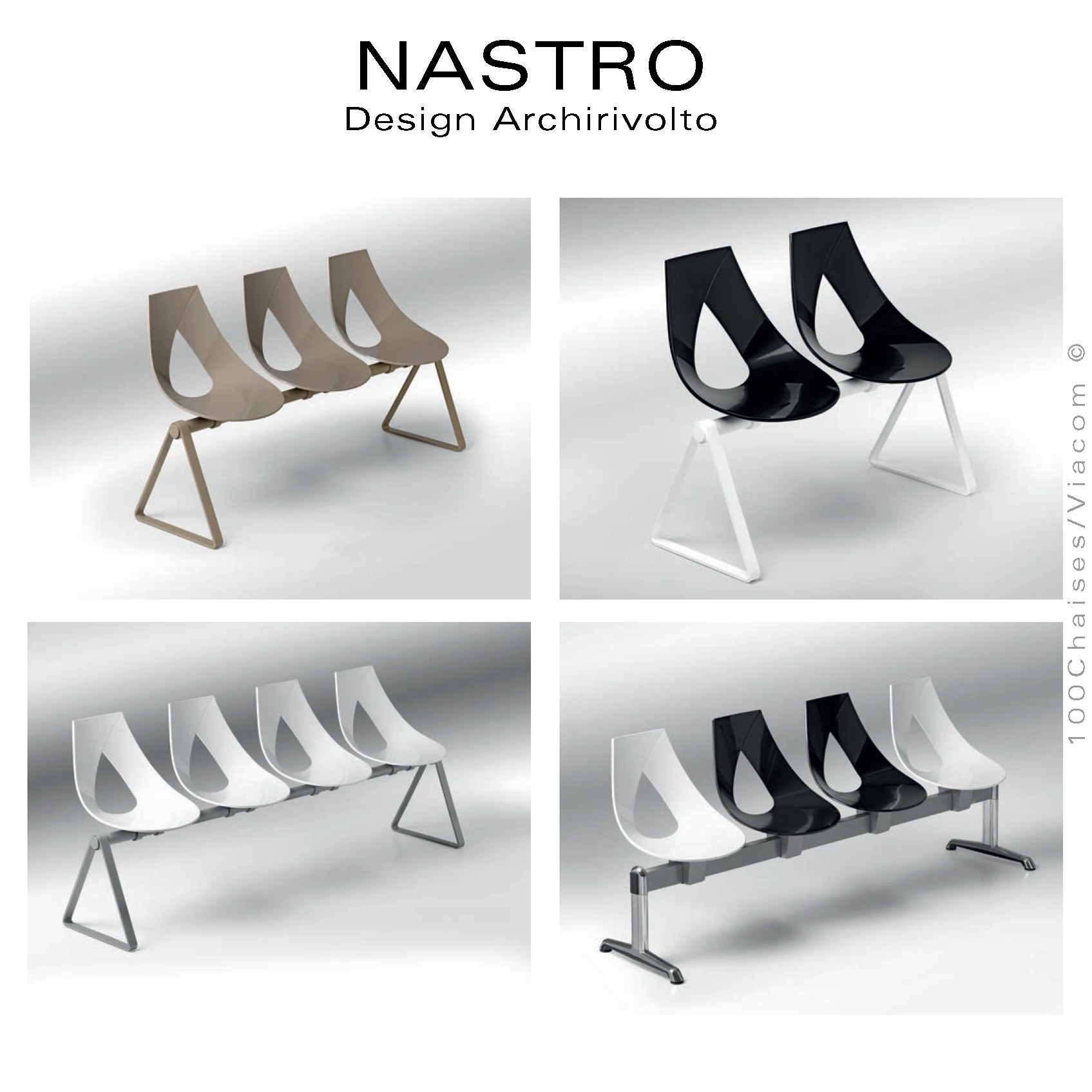 Normes européennesBanc design NASTRO-CA4 ou siège sur poutre pour salle d'attente, assise coque plastique "Restylon" de couleur noir, blanc, taupe, anthracite, vert pomme ou violet. Possibilité de patchwork des couleurs d'assise (mélange) info à commandes@100chaises.fr ou sur l'espace "message" lors de votre commande. Structure poutre de soutien tube d'acier 80x40 mm. finition peinture polyester gris foncé en standard réf.: 3032 MAT, ou autre voir palette peinture fabricant ou dans la gamme RAL. Piétement type "T" en aluminium poli brillant. Avec tampons plastiques de protection des sols. Livré assise démonté avec visseries (option possible sur demande coussin d'assise, cuir synthétique, tissu tissé, velours, feutre etc…) votre demande à commandes@100chaises.fr