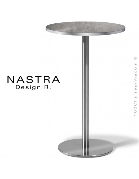 Table mange debout ronde NASTRA, piétement colonne centrale inox / chromé, plateau stratifié aspect bois, chant inox / chromé.