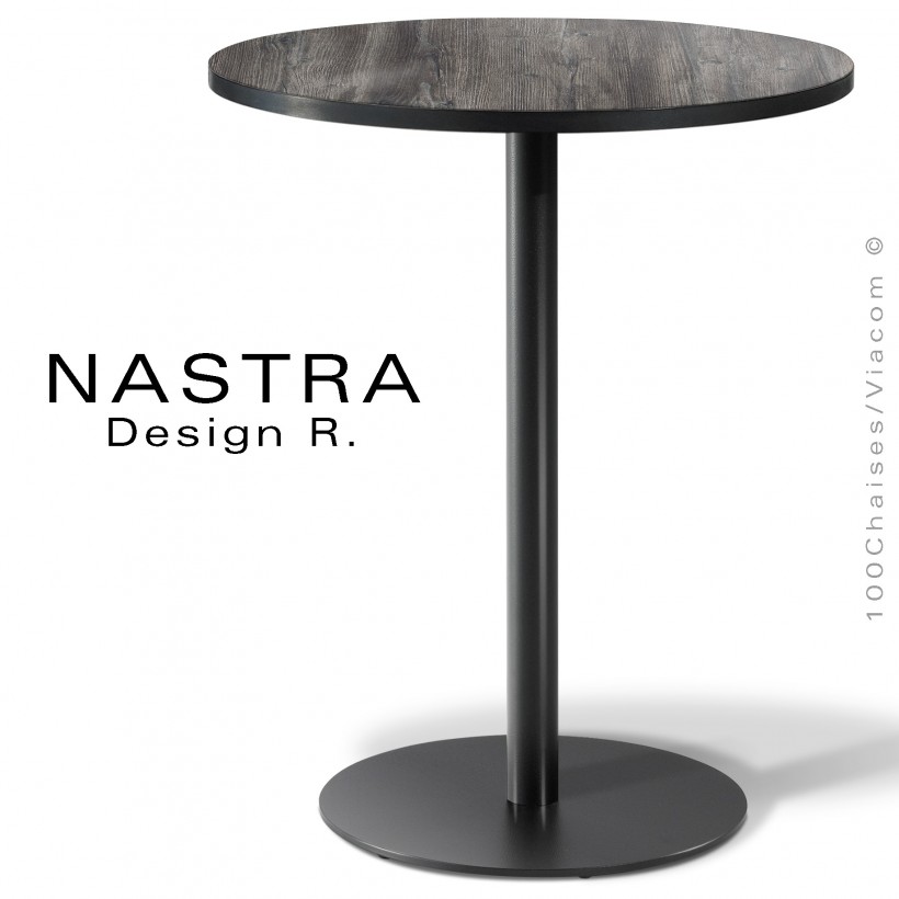 Table de café ronde NASTRA, piétement colonne centrale acier peint, plateau stratifié aspect bois, chant PVC noir.