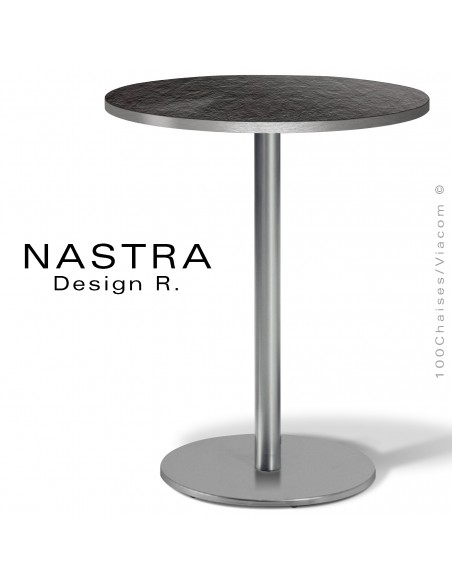 Table ronde pour café, hôtel, restaurant, snack NASTRA-MP, platine de sol base Ø400 mm. avec molettes de mise à niveau, colonne tube d'acier Ø60 mm., finition piétement chromé brillant, inox brossé ou poli. Plateau rond Ø600 et 700 mm., type aggloméré épaisseur 23 mm., finition placage stratifié matière, aspect bois, marbre (autre sur demande), chant plateau chromé brillant ou inox brossé en correspondance avec le choix du piétement. Avec tampons plastiques de protection des sols et molettes de mise à niveau réglable et ajustable.