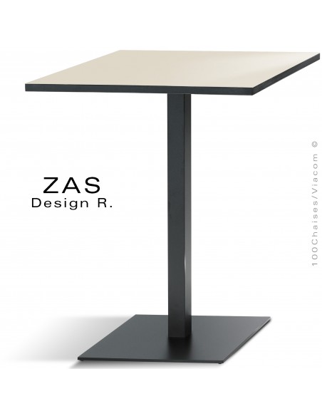 Normes européennesTable repas pour café, hôtel, restaurant ZAS, socle platine de sol base 350x350 mm., colonne tube d'acier 60x60 mm., finition piétement peinture polyester couleur noir brillant, noir mat, gris/argent, gris foncé autre choix (voir gamme fabricant). Avec tampons plastiques de protection des sols et molettes de mise à niveau réglable et ajustable. Dimensions plateau 600x600, 700x700, 800x800 mm., type aggloméré épaisseur 22 mm., avec inserts négatif pour montage. Finition plateau placage stratifié matière et aspect bois, chant plateau PVC noir (autre chant disponible dans la couleur du plateau, voir palette image chant - vos demandes à commandes@100chaises.fr) réponse sous 24h.