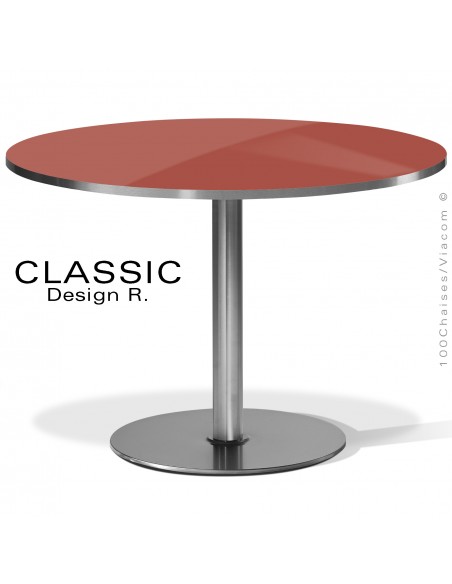 Normes européennesGrande table ronde pour cuisine ou salle à manger ou salle de restauration CLASSIC, piètement colonne centrale tube d'acier Ø80 mm., sur platine de sol ou base ronde Ø500 ou 600 mm., finition chromé brillant, inox brossé, inox poli. Avec molettes de mise à niveau ajustable et tampons plastiques de protections des sols. Plateau type Agglo., épaisseur 22 mm., finition plaquage stratifié unicolore au choix voir palette stratifié. Chant plateau type ABS, chromé brillant, inox brossé, inox poli en accord avec le choix du piétement (autre chant couleur disponible, cuivre brossé, or brossé - vos demandes à commandes@100chaises.fr). Dimensions plateaux : Ø90, 110, 120 cm.