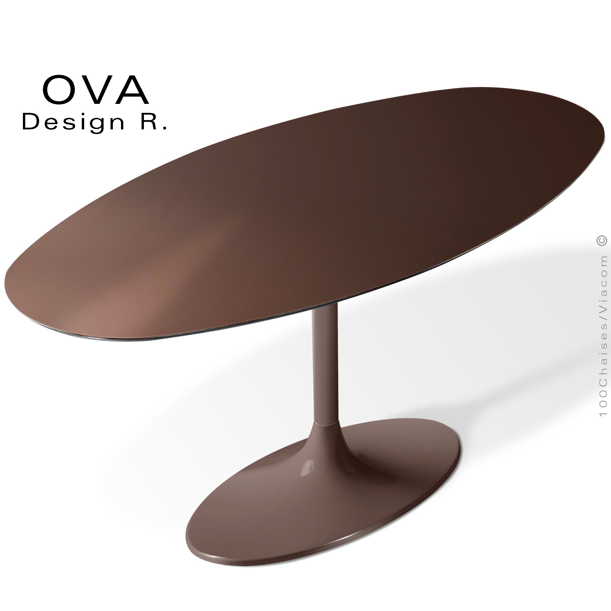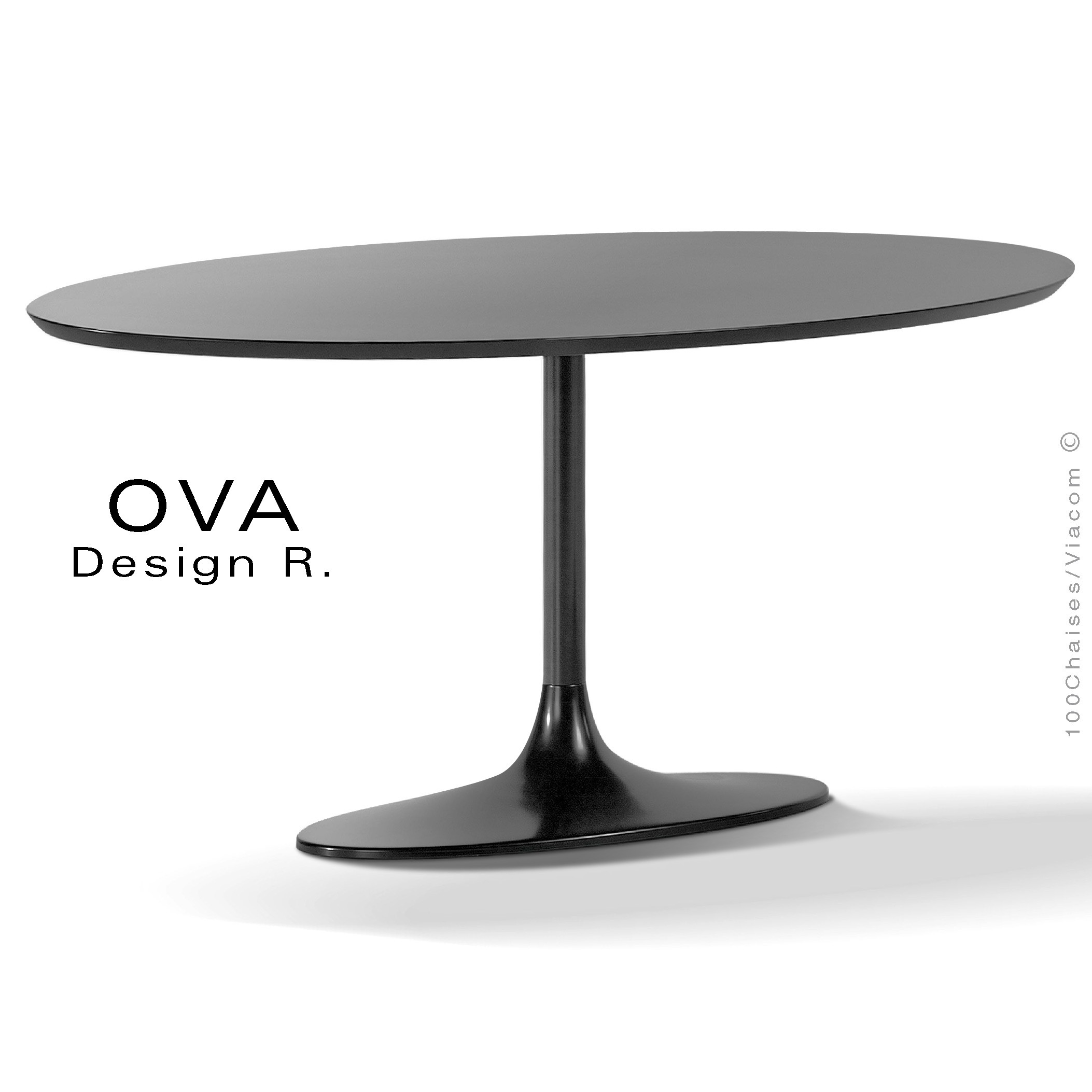 Table design ovale pour salle à manger OVA, piétement colonne centrale type trompette ou tulipe, base ou platine de sol ovale 800x400 mm., colonne tube métal Ø60 mm., peinture polyester blanche mat ou brillant, noir mat ou brillant. Avec tampons plastique de protection des sols. Plateau type MDF, épaisseur standard 23 mm., (épaisseur 31 mm., sur commande) avec inserts négatifs afin de facilité le montage. Chant incliné à 45° sous plateau, finition plaquage stratifié HPL, d'aspect unicolore et texture noir ou blanc (autre finition possible sur demande à commandes@100chaises.fr - voir palette stratifié). Chant plateau peint noir ou blanc au choix. Dimensions plateaux : 160x90 cm. ou 180x90 cm.