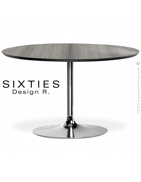 Normes européennesTable ronde design SIXTIES, pour salle à manger ou CHR ou table de travail au bureau. Piétement colonne centrale type trompette ou tulipe en acier tourné, base piètement Ø700 mm., colonne centrale tube d'acier Ø60 mm., finition chromé brillant. Avec tampons plastiques de protection des sols. Plateau type MDF, épaisseur 23 mm., finition placage stratifié HPL aspect bois au choix voir palette fabricant (autre sur demande à commandes@100chaises.fr). Avec inserts négatif sous plateau afin de faciliter le montage. Chant incliné à 45° sous le plateau de couleur noir ou blanc. Dimensions plateaux Ø1100, 1200 ou 1300 mm.
