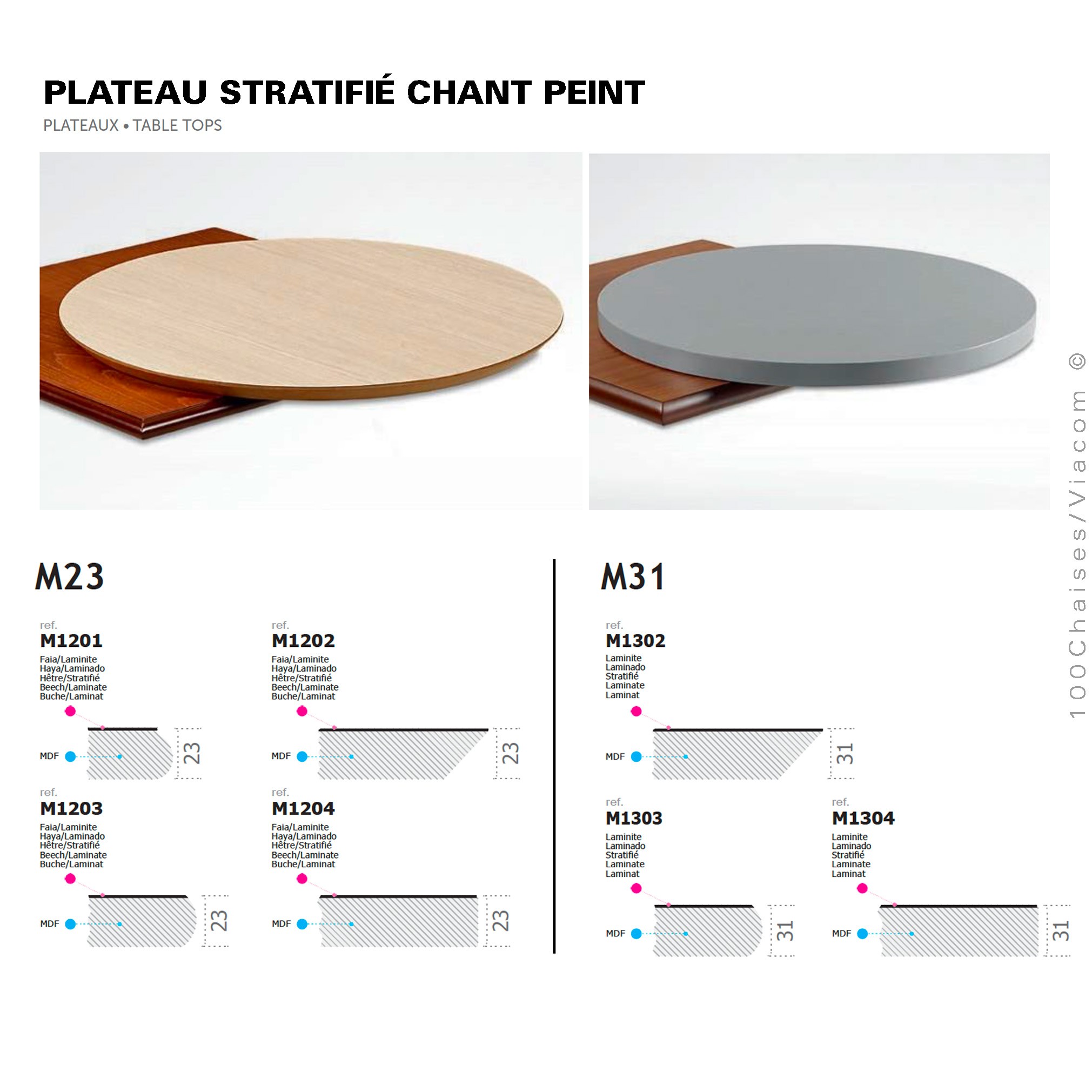 Finition plateau stratifié HPL, chant incliné sous plateau peint noir ou blanc.