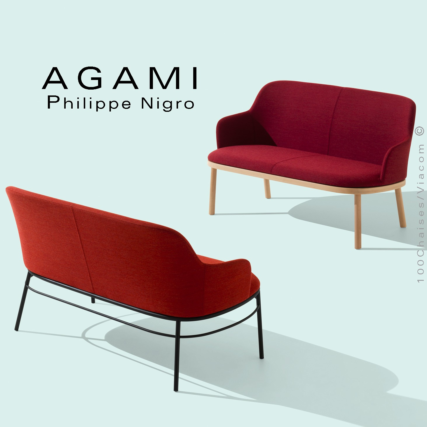 Canapé ou banquette deux places design AGAMI, assise dossier habillage tissu tissé, piétement acier peint ou chromé.