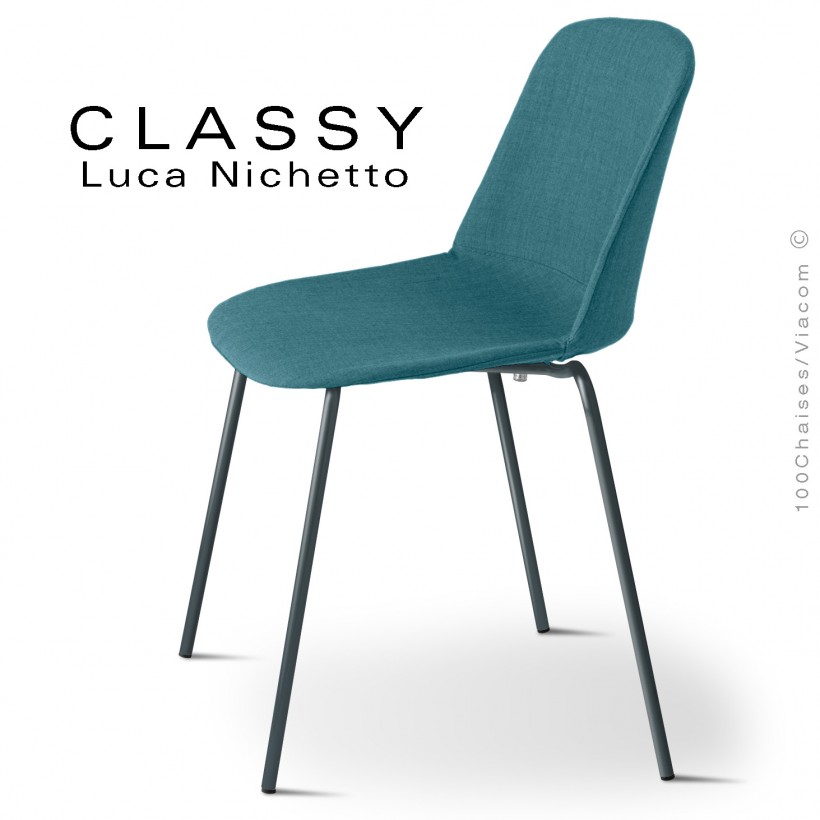 Normes européennesChaise repas design confort CLASSY pour hôtel, café, restaurant, CHR, snack, collectivités, mais aussi pour la maison, cuisine, salle manger et chambre. Convient pour l'intérieur uniquement. Assise coque plastique mono-bloque en polypropylène. Assise et dossier garnis de mousse polyuréthane, habillage tissu tissé, gamme Medley du fabricant Gabriel, composition 100% PL., ignifugé - BS EN 1021 1&2 Cigarette and Match. Couleur tissu voir palette fabricant au choix, autre sur demande. Piètement 4 pieds en tube d'acier Ø15 mm., finition peinture au choix voir palette (image) ou chromé brillant (autre vos demandes à commandes@100chaises.fr). Avec tampons plastiques de protections des sols.
