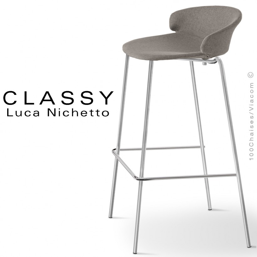 Tabouret de bar confort design CLASSY, piétement acier peint ou chromé, assise coque plus mousse, habillage tissu tissé.