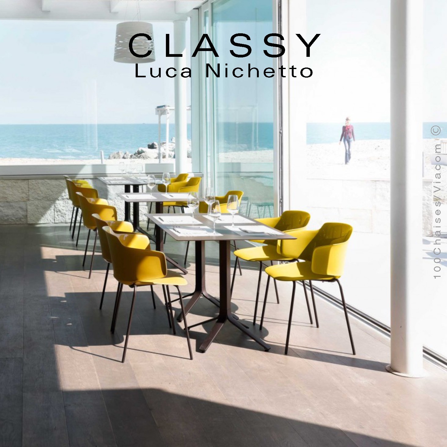 La toute nouvelle gamme Classy est composée d'une chaise, d'un fauteuil et d'un tabouret, Classy est le résultat d'une alchimie exemplaire entre des éléments fonctionnels et une esthétique particulière  que l'on retrouve dans le dessin de la coque, modélisée en douceur pour garantir les plus hauts standards de confort et d'ergonomie. La forme est élégante, rendue encore plus évidente par le jeu des contrastes et l'alternance des surfaces opaques et brillantes. Une famille complète pour une grande variété de solutions qui peuvent se prêter à des combinaisons pour tous les environnements intérieurs et extérieurs.