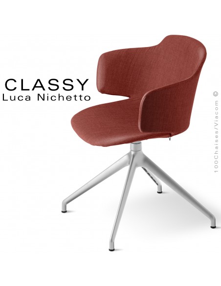 Fauteuil de bureau confort design CLASSY mais aussi pour la maison, cuisine, salle à manger, chambre. Piétement en fonte d'aluminium, terminaison 4 branches. Finition peinture noir ou aluminium brillant, avec tampons plastiques de protection des sols. Assise hauteur fixe, coque plastique monobloque en polypropylène. Assise et dossier garnis de mousse polyuréthane, habillage tissu tissé, gamme Medley du fabricant Gabriel, composition 100% PL., ignifugé - BS EN 1021 1&2 Cigarette and Match. Couleur tissu au choix voir palette fabricant. Avec accoudoirs haut. Assise pivotante à 360°.
