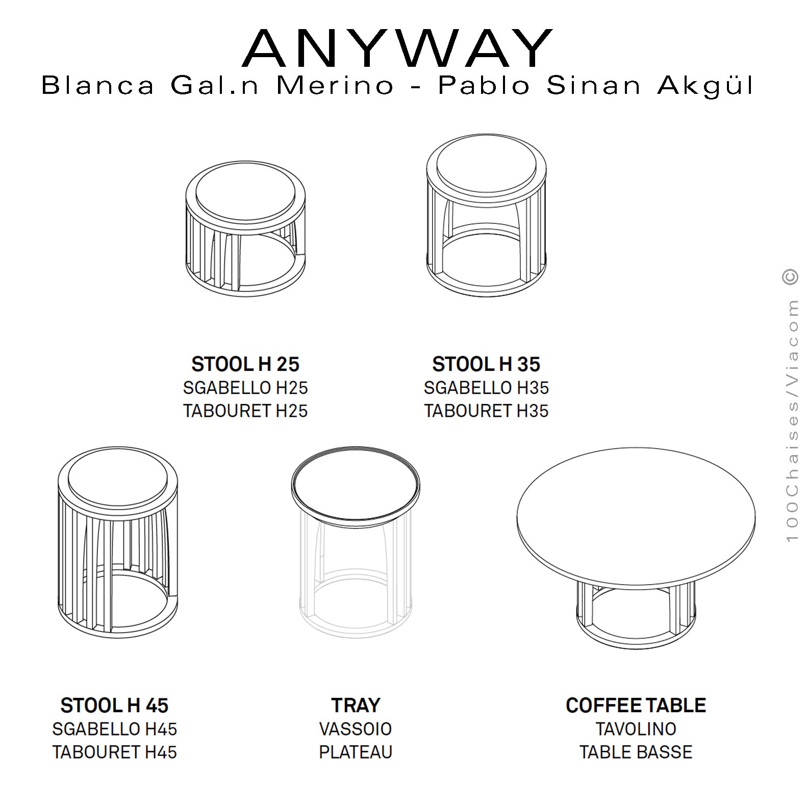 ANYWAY - est une famille d'objets polyvalents en bois verni, capables de s'adapter à différents usages et environnements: tabouret, table de chevet, table basse, siège, support, et même devenir une bibliothèque en les empilant les uns sur les autres. Le projet est né à l'occasion du concours de la Journée du design italien 2020 intitulé "Design : un voyage entre l'Italie et l'Espagne", destiné aux jeunes créatifs et aux étudiants espagnols de moins de 35 ans, en collaboration avec l'ambassade d'Italie à Madrid et le consulat général à Barcelone, et le magazine Interni.