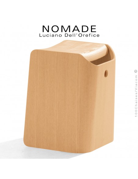 Normes européennesTabouret bois NOMADE, s'inspire de la culture japonaise, structure multiplis de bois, épaisseur 20 mm., cintré à la vapeur, finition placage bois naturel de Frêne ou chêne, vernis naturel incolore ou foncé. Assise bois de Frêne ou Chêne massif. Un produit polyvalent, parfait pour les environnements domestiques et contractuels, avec une grande sensibilité au thème de la durabilité et en même temps léger et ludique. Son langage ludique invite à se déplacer, à s'adapter aux espaces et à se composer au gré des besoins aléatoires que chaque situation présente. Avec patin polypropylène pour la protection des sols.
