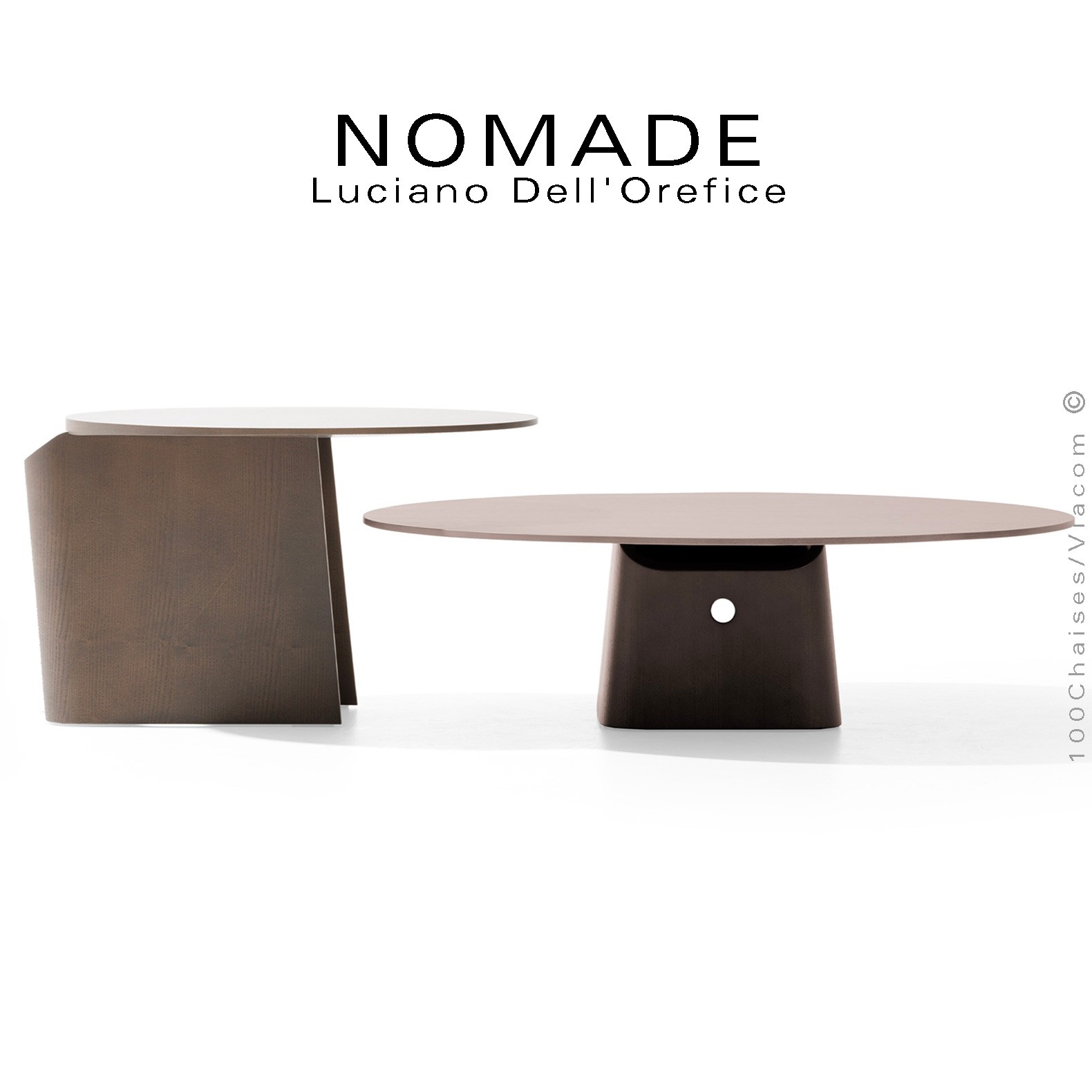 Table basse bois NOMADE, s'inspire de la culture japonaise, structure multiplis de bois, épaisseur 20 mm., cintré à la vapeur, plateau Ø900 mm., hauteur 255 mm. Finition placage bois naturel de Frêne ou chêne, vernis naturel incolore ou foncé. Un produit polyvalent, parfait pour les environnements domestiques et contractuels, avec une grande sensibilité au thème de la durabilité et en même temps léger et ludique. Son langage ludique invite à se déplacer, à s'adapter aux espaces et à se composer au gré des besoins aléatoires que chaque situation présente. Avec patin polypropylène pour la protection des sols.