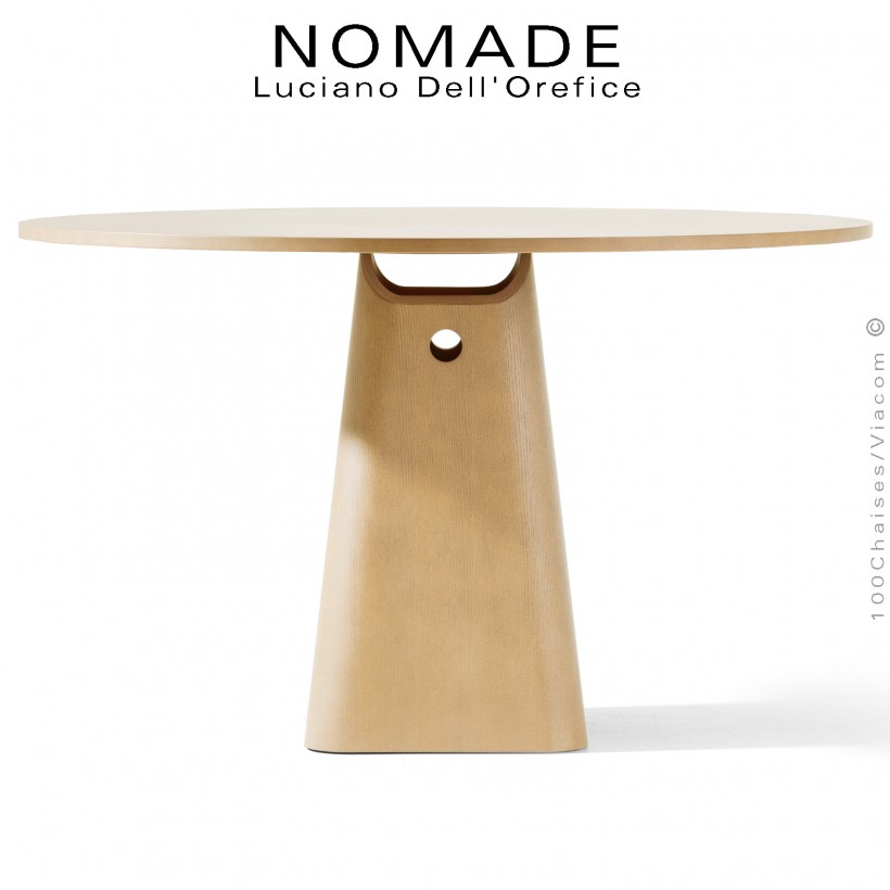 Normes européennesTable repas bois NOMADE, s'inspire de la culture japonaise, structure multiplis de bois, épaisseur 20 mm., cintré à la vapeur, plateau Ø1200 mm., hauteur 735 cm. Finition placage bois naturel de Frêne ou chêne, vernis naturel incolore ou foncé. Un produit polyvalent, parfait pour les environnements domestiques et contractuels, avec une grande sensibilité au thème de la durabilité et en même temps léger et ludique. Son langage ludique invite à se déplacer, à s'adapter aux espaces et à se composer au gré des besoins aléatoires que chaque situation présente. Avec patin polypropylène pour la protection des sols.