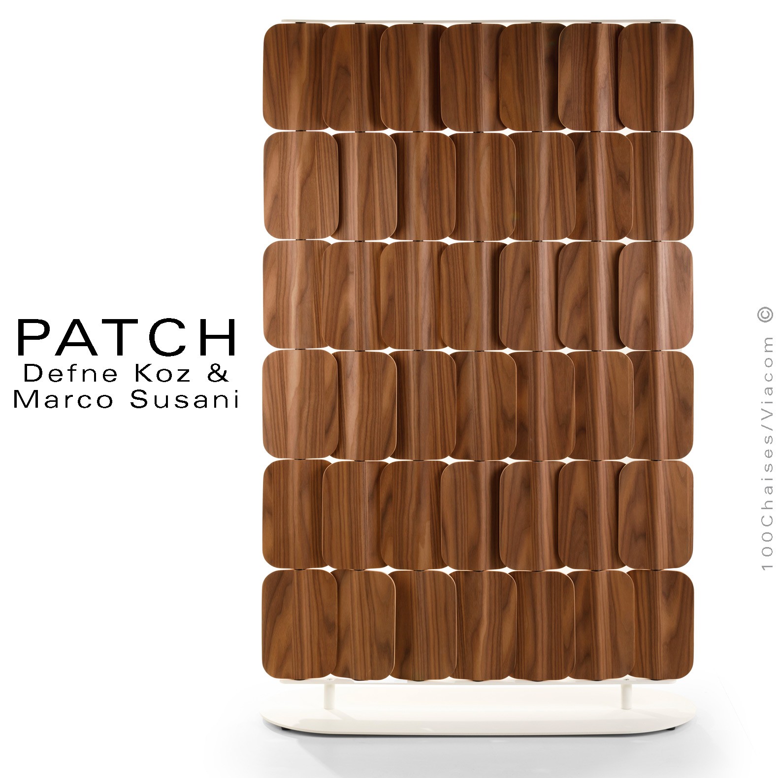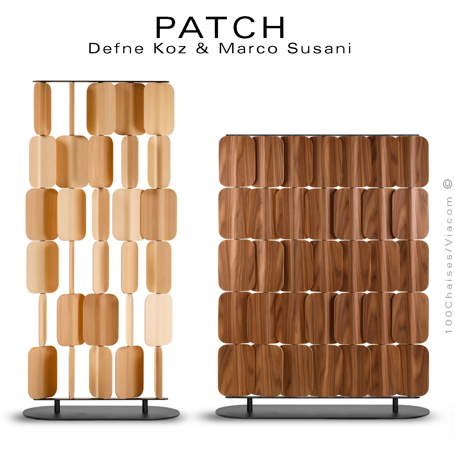 PATCH-182x120, une collection de panneaux de séparation insonorisants capables de garantir l'intimité sans s'isoler du milieu environnant. La structure autoportante acier peint, permet l'intégration d'éléments individuels en bois de Frêne, Chêne ou noyer qui peuvent tourner librement sur eux-mêmes, s'ouvrant et se fermant selon les besoins. Le module, en plus d'assurer le confort acoustique, convient pour rythmer et meubler les lieux de travail, les espaces ouverts, les salons d'hôtel, mais aussi les habitations privées. Dimensions hauteur 182, largeur 120 cm. Option possible sur demande avec roulettes x4 en aluminium et en caoutchouc, mécanique bloquante. Panneau déco. version patchwork, en bois essence de Frêne finition teinté : naturel, Chêne clair, Chêne foncé, Noyer.