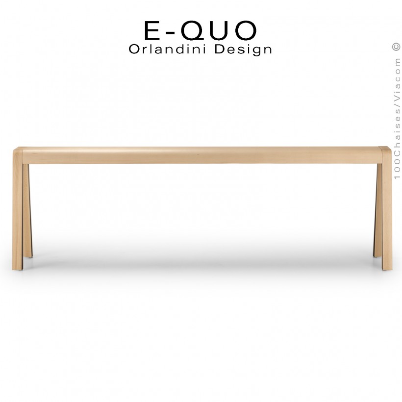 Banc bois massif design E-QUO, assise 4 places pour table haute, structure essence Frêne ou Chêne, avec coussin d'assise.
