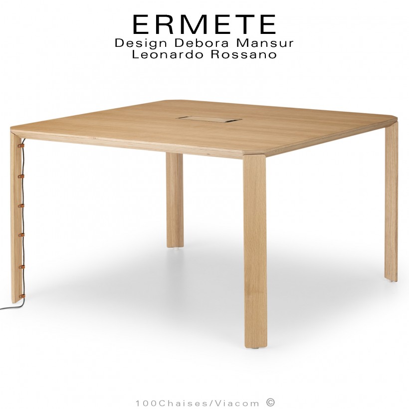 Normes européennesTable repas ou bureau carré ERMETE, structure 4 pieds bois de Chêne massif avec tampons plastiques de protection des sols et molettes de mise à niveau. Fixations piétements complément invisible en option. Dimensions plateaux : 130x130 et 150x150 cm., composition plateau multiplis de bois de Bouleau, épaisseur 40 mm. Finition plateau placage bois de Chêne naturel ou stratifié HPL blanc ou aspect bois (autre finition possible, nouvelle collection de placage fabricant ARPA couleur unie ou aspect bois, pour plateau, voir palette échantillon sous forme d'image).