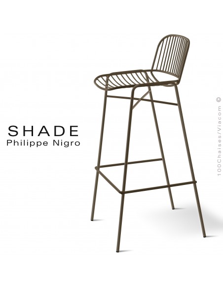 Tabouret de bar design SHADE, pour café, hôtel, restaurant ou encore espace particulier intérieur et extérieur. Structure en tube d'acier Ø13 mm., avec repose-pieds, assise et dossier en tige ou rond d'acier finition peinture au choix (14 couleurs voir palette fabricant). Piètement 4 pieds, avec tampons plastiques de protection des sols, tabouret empilable par 6 pièces. Version pour extérieur avec traitement par cataphorèse, une finition peinture très résistante aux aléas climatiques et milieu salin. Option avec coussin d'assise garnie de mousse polyuréthane, habillage tissu gamme REVIVA HERO, couleur marron-601. Composition : 100% PET recyclé et recyclable (fil de polyester fabriqué à partir de bouteilles post-consommation), autres gammes sur demande PANAREA - REVIVA IRIS - REVIVA AMELIA - FABTHIRTY, pour extérieur traitement hydrofuge avec boucles d'accroches. Vos demandes à commandes@100chaises.fr
