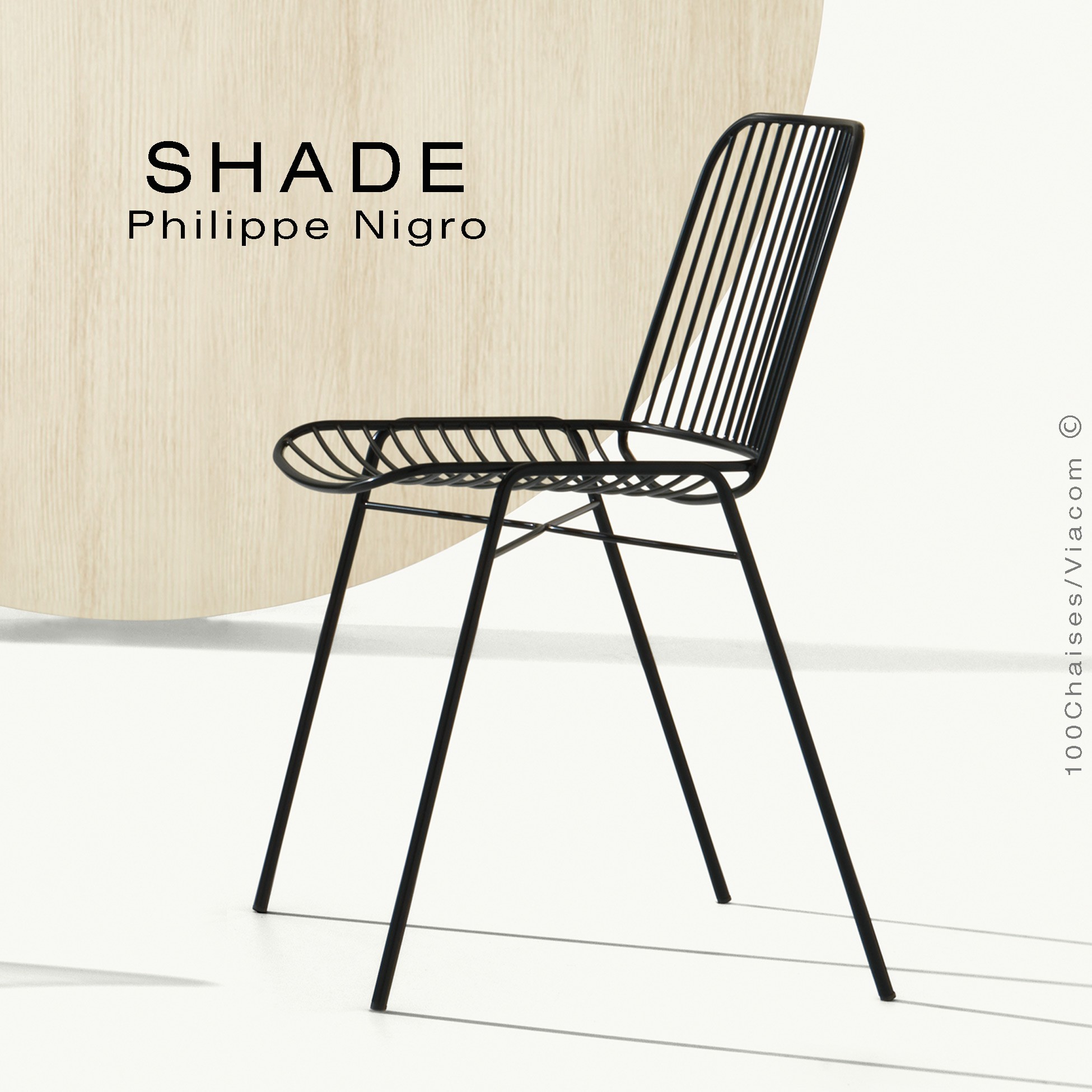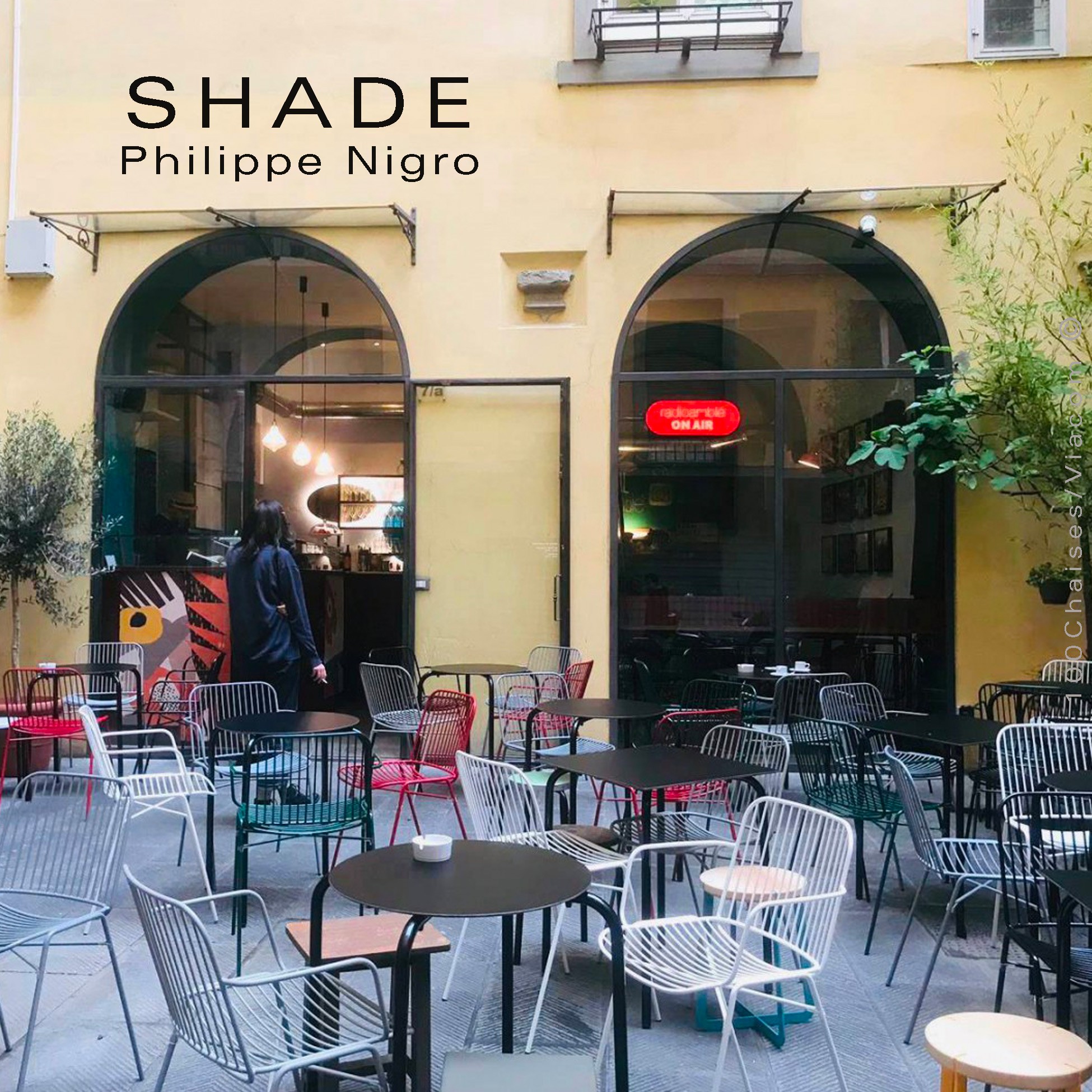 SHADE est une collection comprenant une chaise, un fauteuil, un tabouret de cuisine et un de bar. La série se caractérisée par sa finesse, la présence du vide dans les assises participent à sa légèreté visuelle. La collection laisse pénétrer la lumière à travers elle pour imprimer, redessiner l'assise au sol, créant un jeu de lumière par grand soleil. Elle s'adaptera à l'intérieur comme à l’extérieur avec le traitement cataphorèse, une finition reprise de l'univers automobile qui procure une grande résistance en extérieur.