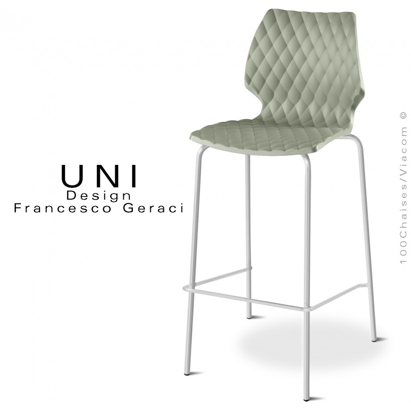 Tabouret de bar design UNI, assise coque plastique effet matelassé en polypropylène, monobloc, teinté dans la masse, d'aspect mat côté assise, finition brillante pour le dos. Couleurs disponibles : anthracite - argile - blanche - bleu poudre - gris petit gris - gris Tourterelle - noir - vert Olive - vert Pistache - rouge Corail de couleur voir palette. Piétement 4 pieds en tube d'acier Ø16 mm., avec repose-pieds. Finition peint ou chromé brillant. Convient essentiellement pour l'intérieur pour la version chromé, en extérieur version peint. Avec tampons plastiques de protections des sols.