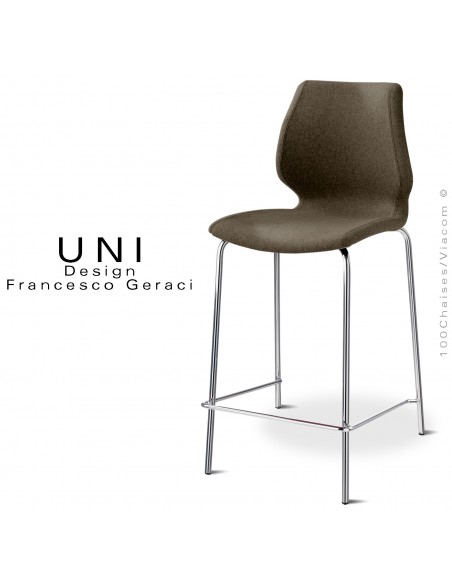 Tabouret de cuisine confort design UNI, assise coque plastique effet matelassé en polypropylène, monobloc, teinté dans la masse, d'aspect brillante pour le dos. Couleurs disponibles sur demande : anthracite - argile - blanche - bleu poudre - gris petit gris - gris Tourterelle - noir - vert Olive - vert Pistache - rouge Corail de couleur voir palette. Assise et dossier habillage tissu tissé, gamme Medley du fabricant Gabriel, composition 100% PL., ignifugé - BS EN 1021 1&2 Cigarette and Match. Couleur tissu au choix voir palette fabricant. Piétement 4 pieds en tube d'acier Ø16 mm., avec repose-pieds. Finition peint ou chromé brillant. Convient essentiellement pour l'intérieur. Avec tampons plastiques de protections des sols.