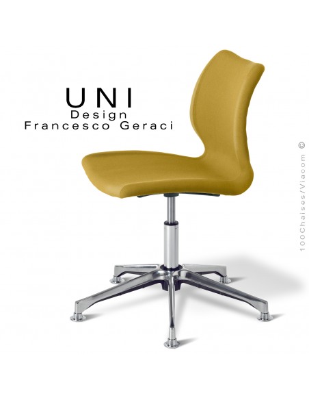Chaise de bureau confort UNI, piétement colonne centrale aluminium brillant, assise tissu gamme Medley couleur jaune.