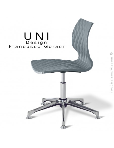 Chaise du bureau UNI, assise et dossier coque plastique, effet matelassé, monobloc, teinté dans la masse. Couleur assise disponible : anthracite - argile - blanche - bleu poudre - gris petit gris - gris Tourterelle - noir - vert Olive - vert Pistache - rouge Corail de couleur voir palette au choix. Assise et dossier pivotant à 360°. Piétement 5 branches aluminium brillant ou aluminium black (noir) sur colonne centrale Ø50 mm., avec élévation par vérin à gaz. Avec tampons plastiques de protections des sols. Convient essentiellement pour l'intérieur.
