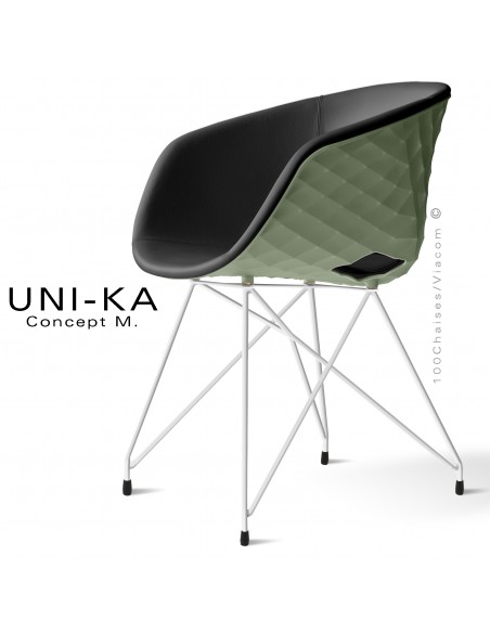 Fauteuil chic et tendance UNIKA, piétement type Eiffel peint blanc, coque plastique vert pistache, habillage cuir noir.