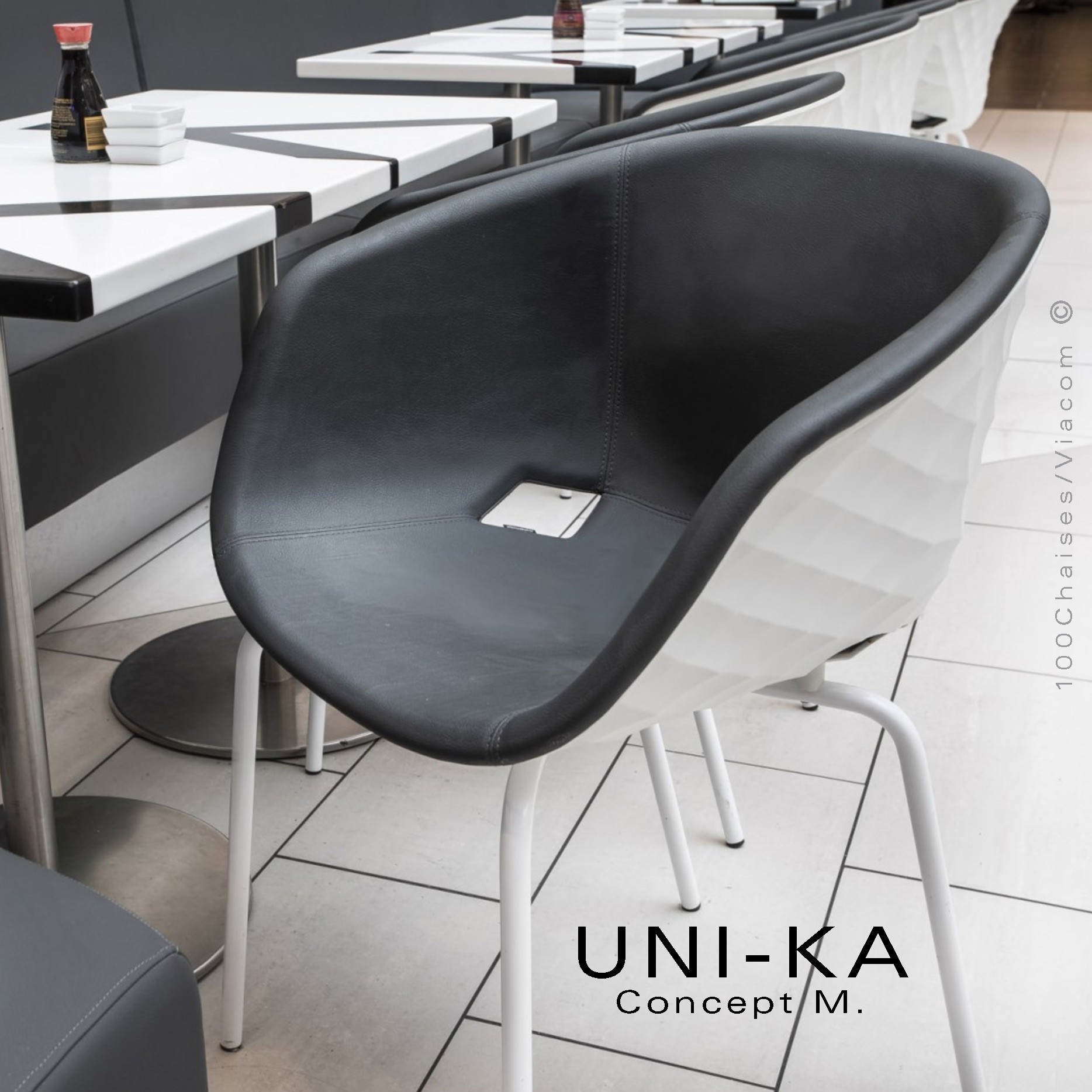 Fauteuil design chic et tendance UNI-KA, structure coque plastique polypropylène, monobloc, teinté dans la masse effet matelassé. Assise garnie de mousse polyuréthane, habillage cuir synthétique du fabricant Abitex, gamme INCA, composition 88% PVC, 6% PL, 6% CO. Couleur standard Noir-42 et Ciment-55 (autre sur demande suivant palette fabricant). Classification feu M2, EN 1021 part 1/2, NF D-60 013 (AM.18). Piètement type Eiffel en rond ou fil d'acier Ø10 mm., finition peint au choix voir palette finition peinture ou chromé brillant avec tampons plastiques de protections des sols.
