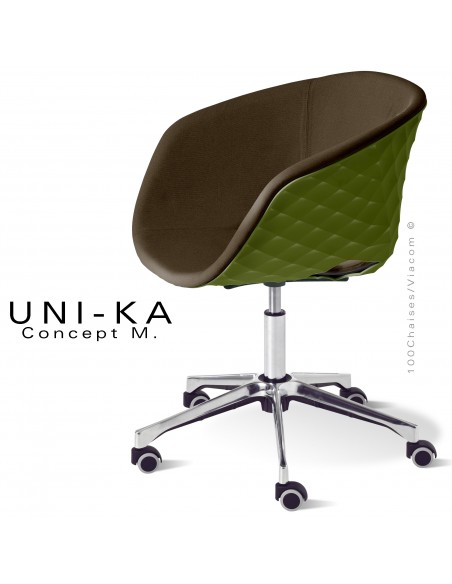 Fauteuil de bureau confort UNIKA, piétement aluminium brillant sur roulettes, coque plastique olive, tissu couleur marron.