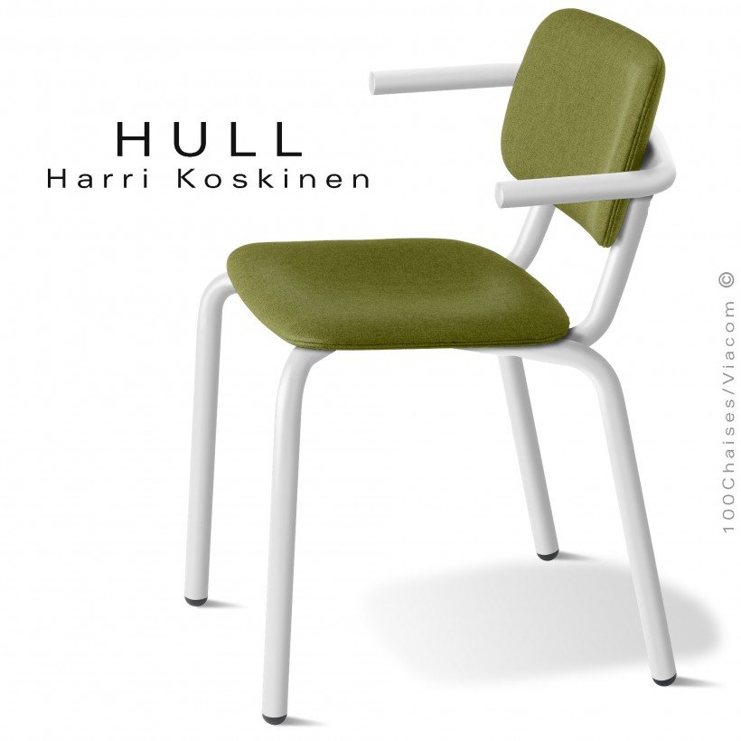 Normes européennesFauteuil HULL, pour la restauration collective cantines administratives et scolaires mais aussi pour les cafés, hôtels, restaurants ou espace privatif. Avec petit accoudoirs et piétement en tubes d'acier de 30 mm., 4 pieds, finition peinture (voir palette peinture acier au choix), avec tampons plastiques de protection des sols. Assise et dossier structure en multiplis de bois de hêtre avec une légère courbure ergonomique sur l'avant de l'assise. Garnis de mousse polyuréthane, habillage tissu tissé gamme Medley du fabricant Gabriel, couleur au choix voir palette. Autre finition possible vos demandes à commandes@100chaises.fr