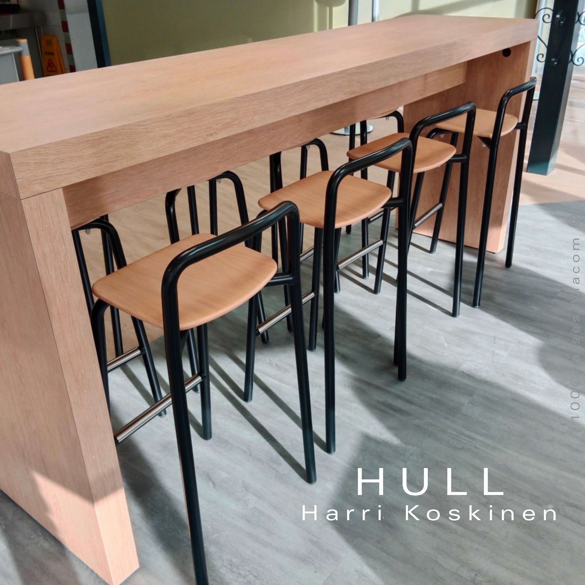 «La famille de sièges Hull est caractérisée par une composition à la fois classique et originale. Les parties métalliques décrivent des formes galbées et s'unissent aux parties courbes en bois pour offrir le plus grand confort. Le design d'ensemble est harmonieux et équilibré et s'adapte avec facilité à différents contextes et situations.» Harri Koskinen.