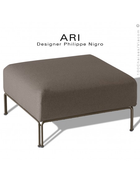 Normes européennesPouf pour salon d'extérieur ou module pour banquette multiple linéaire ARI, structure 4 pieds en tube d'acier rond Ø25 mm., piétement double tube d'acier juxtaposé, se séparant sous l'assise, afin de former l'ossature du poufe. Assise composé d'un châssis en fil d’acier pour garantir le confort d'assise et un bon maintient, finition structure acier peinture polyester pour extérieur-outdoor. Couleur peinture au choix suivant gamme (voir palette peinture). L'assise se composent d'un large et confortable coussin, assurant ainsi un confort pour une détente maximum. Le coussin est rembourré de mousse haut densité, avec un habillage tissu dans la gamme Reviva Hero du fabricant REVIVA, composition : 100% recyclable PET (fil de polyester fabriqué à partir de bouteilles en plastique de post-consommation). Attention tissu non imperméable à l'eau, en cas d'orage à conserver à l'abri. La collection ARI se compose d'éléments angulaires, linéaires, terminaux (un accoudoir droite ou gauche), fauteuil, poufs et d'une petite table basse.