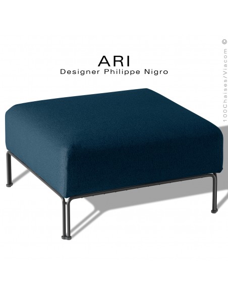 Normes européennesPouf pour salon d'extérieur ou module pour banquette multiple linéaire ARI, structure 4 pieds en tube d'acier rond Ø25 mm., piétement double tube d'acier juxtaposé, se séparant sous l'assise, afin de former l'ossature du poufe. Assise composé d'un châssis en fil d’acier pour garantir le confort d'assise et un bon maintient, finition structure acier peinture polyester pour extérieur-outdoor. Couleur peinture au choix suivant gamme (voir palette peinture). L'assise se composent d'un large et confortable coussin, assurant ainsi un confort pour une détente maximum. Le coussin est rembourré de mousse haut densité, avec un habillage tissu dans la gamme Reviva Hero du fabricant REVIVA, composition : 100% recyclable PET (fil de polyester fabriqué à partir de bouteilles en plastique de post-consommation). Attention tissu non imperméable à l'eau, en cas d'orage à conserver à l'abri. La collection ARI se compose d'éléments angulaires, linéaires, terminaux (un accoudoir droite ou gauche), fauteuil, poufs et d'une petite table basse.