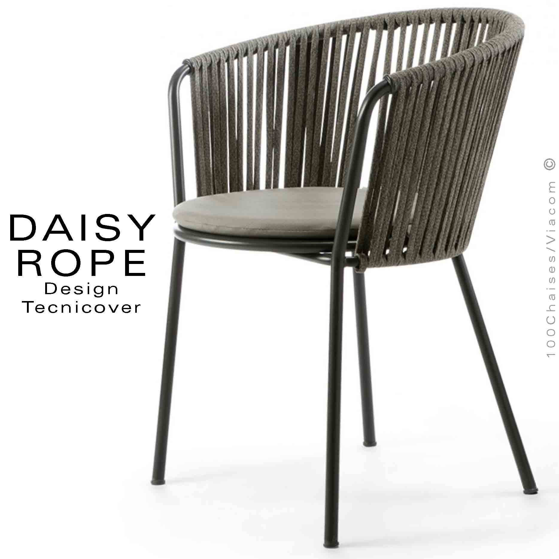 Normes européennesTabouret de bar d'extérieur pour jardin et terrasse DAISY-ROP, structure tube d'acier 22 mm., avec accoudoirs et repose pieds et tampons plastique de protection des sols. Finition structure, peint avec des poudres polyester thermodurcissables Qualicoat de classe 1 et 2., couleur au choix suivant palette fabricant. Tressage cordage par corde de 30 mm., la corde synthétique est fabriquée à partir d'une fibre polyoléfine italienne brevetée pour un usage extérieur (65% Olyna / 35% Polyester). Cette fibre est parfaitement imperméable, antitache, antibactérienne et résistante aux rayons UV, au chlore et à l'humidité. Couleur corde au choix anthracite, marron foncé, gris Tourterelle. L'assise le coussin est fabriqué dans des tissus de haute qualité, résistant aux rayons U.V., conservant ainsi les couleurs pendant longtemps. Le coussin d'assise est enduit à l'intérieur d'une couche de PVC, ce qui le rend imperméable, tout en laissant respirer la mousse polyuréthane haute densité intérieur, afin de lutter contre la formation de moisissures. Habillage coussin tissu gamme PANAMA, couleur au choix voir palette fabricant (image) - Personnalisable à la demande à commandes@100chaises.fr