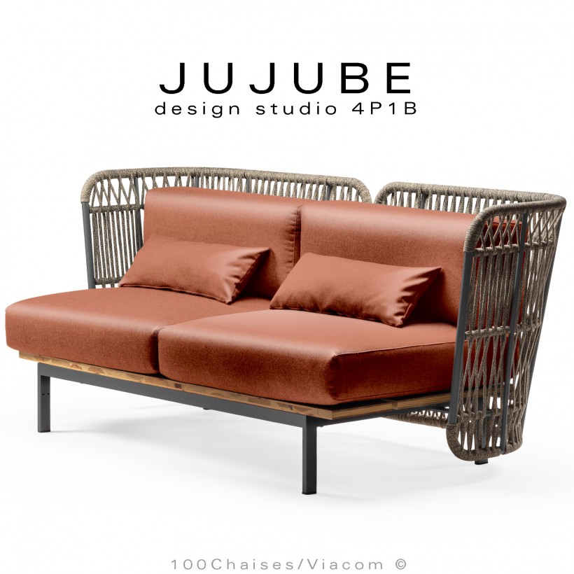 Normes européennesCanapé d'extérieur JUJUBE, assise deux places. Structure tube Ø20/15 mm., piétement tube 40x25 mm., Finition traitement galvanisé pour l'extérieur avec peinture par poudrage ou thermolaquage. Couleur disponible : anthracite, sable. Avec tampons plastiques de protection des sols. Support assise plateau bois Mélèze, épaisseur 22 mm. Deux coussins d'assise, deux coussins dossier + 2 coussins confort lombaire, garnis de mousse polyester haute résilience afin d'éviter tout risque d'affaissement. habillage gamme Vortice Nattè du fabricant Abitex. Composition : 100% Acrylique. Couleur tissu au choix voir palette fabricant. Dossier et accoudoirs tressage corde marine couleur au choix. Vortice assure une très grande résistance à la lumière. Le traitement Teflon le transforme presque en super-héros du tissu. Il est hydrofuge et résiste aux intempéries, anti-tâches, anti-moisissures. Garantie pendant 5 ans. Autre option possible dossier tissu matelassé. Mobilier qui convient en intérieur comme en extérieur - Vos demandes spécifiques à commandes@100chaises.fr