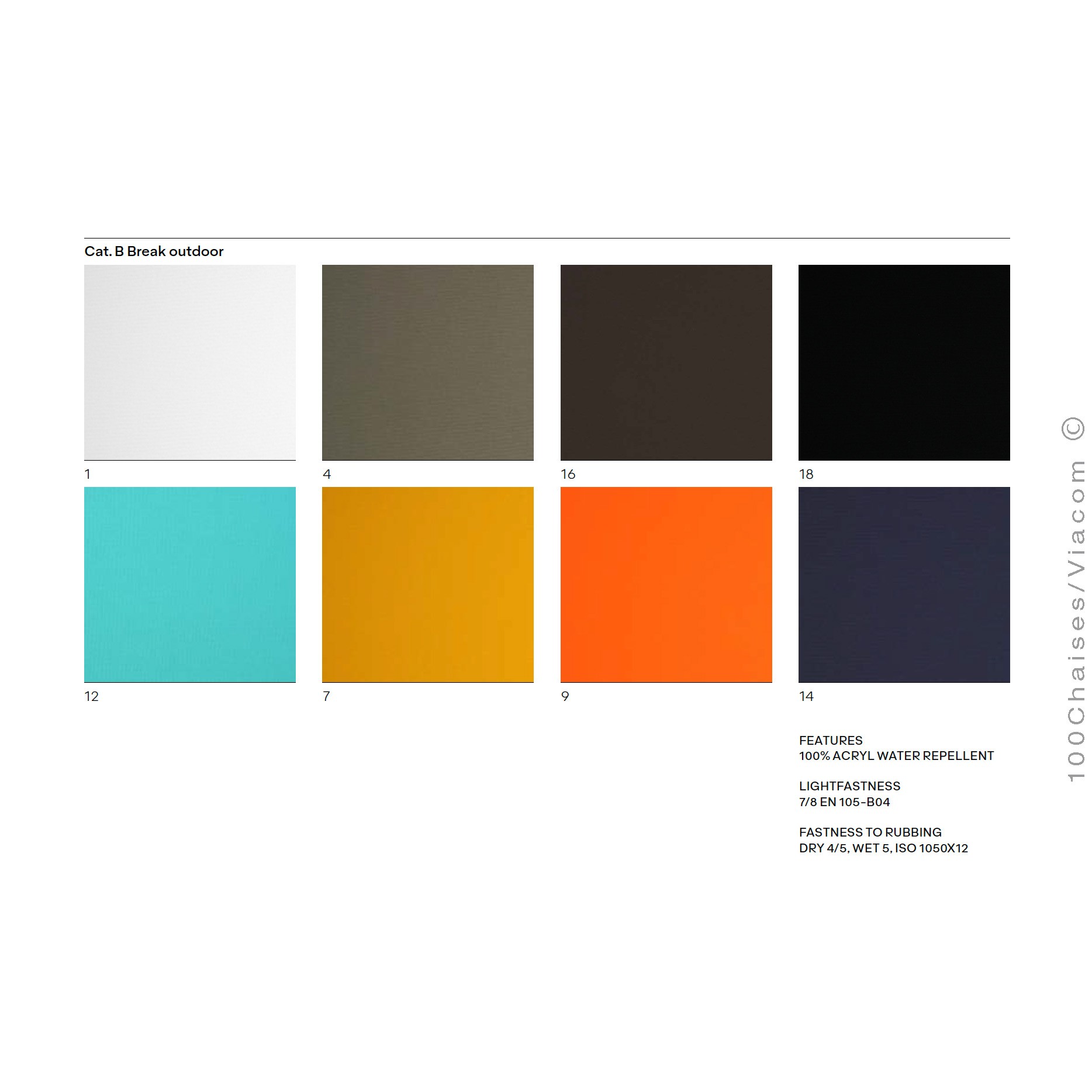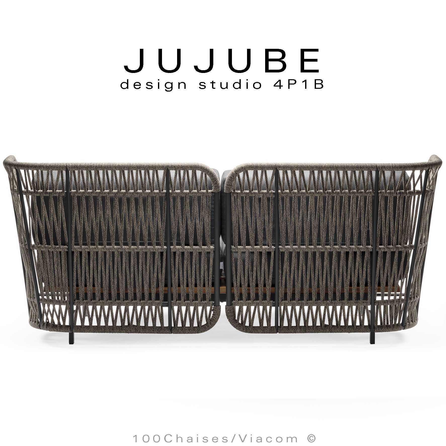 Normes européennesCanapé d'extérieur JUJUBE, assise deux places. Structure tube Ø20/15 mm., piétement tube 40x25 mm., Finition traitement galvanisé pour l'extérieur avec peinture par poudrage ou thermolaquage. Couleur disponible : anthracite, sable. Avec tampons plastiques de protection des sols. Support assise plateau bois Mélèze, épaisseur 22 mm. Deux coussins d'assise, deux coussins dossier + 2 coussins confort lombaire, garnis de mousse polyester haute résilience afin d'éviter tout risque d'affaissement. habillage gamme Vortice Nattè du fabricant Abitex. Composition : 100% Acrylique. Couleur tissu au choix voir palette fabricant. Dossier et accoudoirs tressage corde marine couleur au choix. Vortice assure une très grande résistance à la lumière. Le traitement Teflon le transforme presque en super-héros du tissu. Il est hydrofuge et résiste aux intempéries, anti-tâches, anti-moisissures. Garantie pendant 5 ans. Autre option possible dossier tissu matelassé. Mobilier qui convient en intérieur comme en extérieur - Vos demandes spécifiques à commandes@100chaises.fr