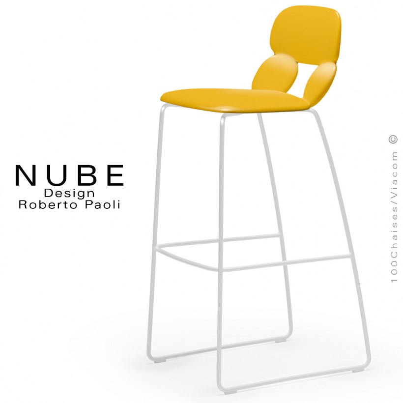 Tabouret de bar ou domestique design NUBE, piétement luge peint blanc, assise coque plastique souple jaune.