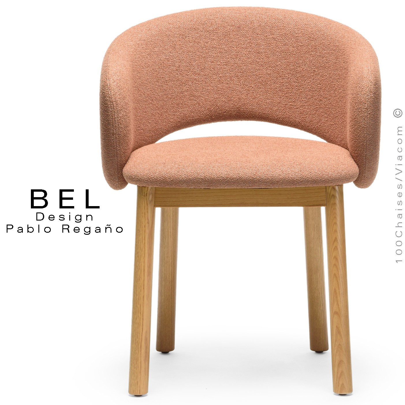 Fauteuil restauration, repas confortable et design BEL, pour café, hôtel, salle de restauration, bars, CHR et domestique, chambre, bureau, cuisine, salle à manger. Structure 4 pieds en bois massif de Frêne rond Ø45 mm., avec tampons plastique de protection des sols. Finition piétement bois vernis naturel, noyer ou teinté noir. Assise et dossier garnis de mousse polyuréthane, habillage tissu tissé gamme Auckland du fabricant VESCOM, un tissu d'ameublement bouclé avec une grille bicolore, ludique et non directionnelle. Composition : 76% polyester recyclé FR. / 24% polyester FR. Ignifuge : NF D 60-013 - AM18 / NF P 92503-507 - M1. Autre tissu, velours, 100% laine ou cuir synthétique disponible voir palette sous forme d'image. Vos demandes à : commandes@100chaises.fr