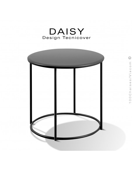 Normes européennesPetite table basse d'appoint pour salon d'extérieur design DAISY, structure 4 pieds en rond ou fil d'acier 10 mm., traitement galvanisé avec tampons plastique de protection des sols. Plateau deux dimensions rond Ø430 mm. et 600 mm., chant arrondi. Une seul hauteur 450 mm. Finition peinture époxy au choix voir gamme fabricant (image).