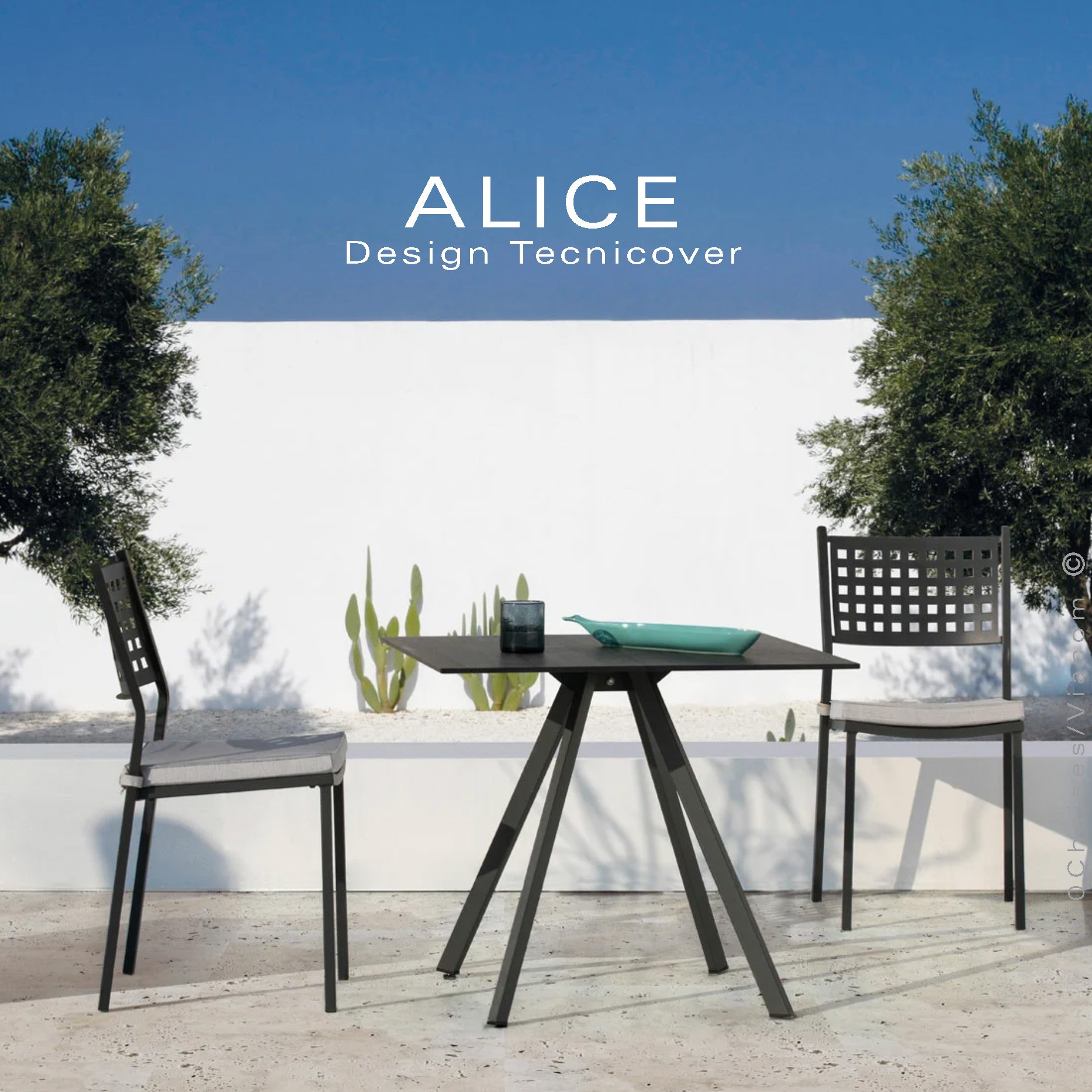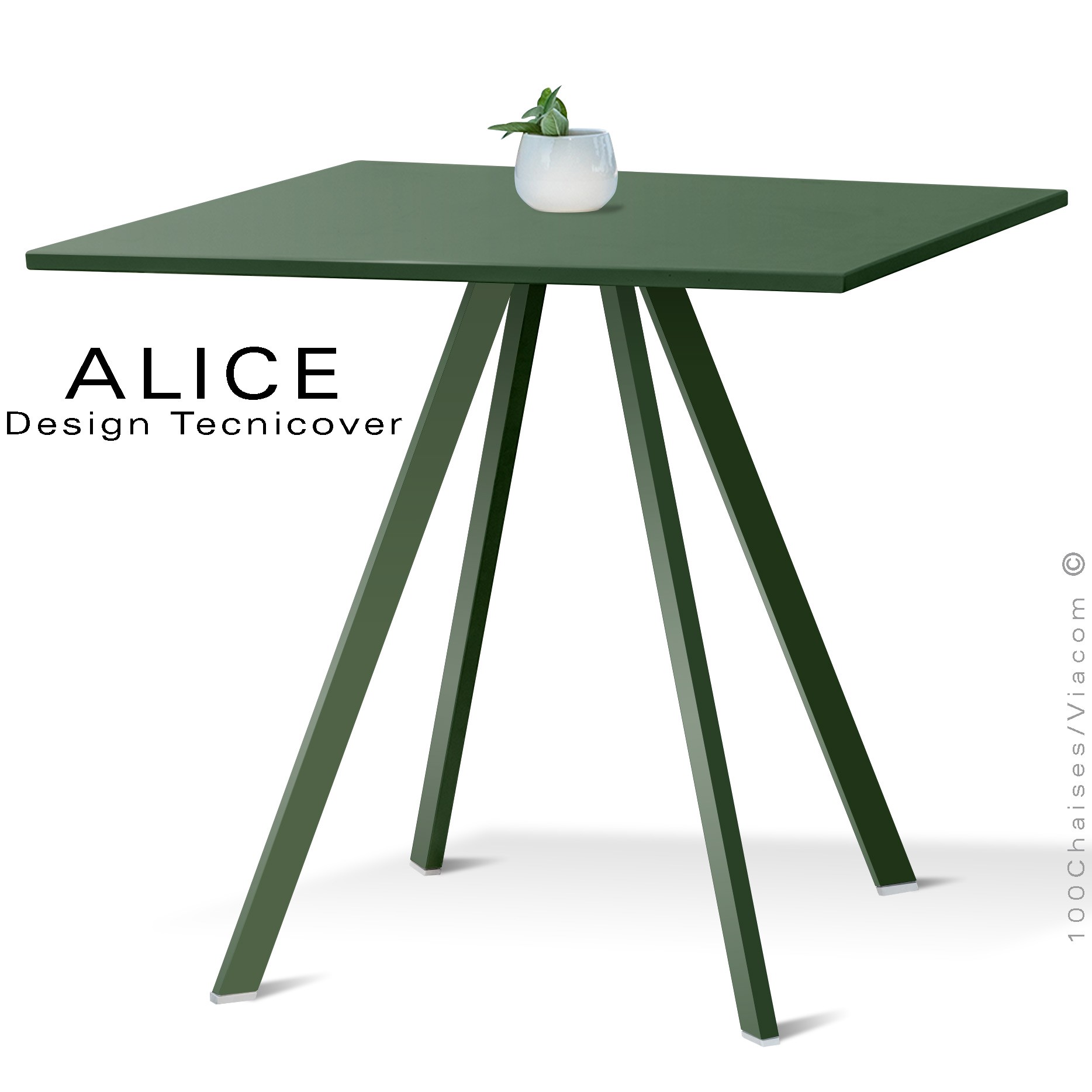 Table repas design pour extérieur ALICE, structure 4 pieds en tube d'acier galvanisé carré 40x40 mm., avec tampons plastique de protection des sols. Plateaux rond ou carré, dimensions : 600x600 mm., 700x700 mm. ou rond Ø800 mm. Suivant la dimension du plateau différente option pour le chant, arrondi, droit ou incliné sous plateau. Deux épaisseurs plateaux 18 ou 28 mm. L'ensemble piétement plateau reçoit un traitement galvanisé avec une finition peinture époxy au choix voir gamme fabricant (image). Hauteur table 1100 mm avec plateau - Lot de 2 pièces.