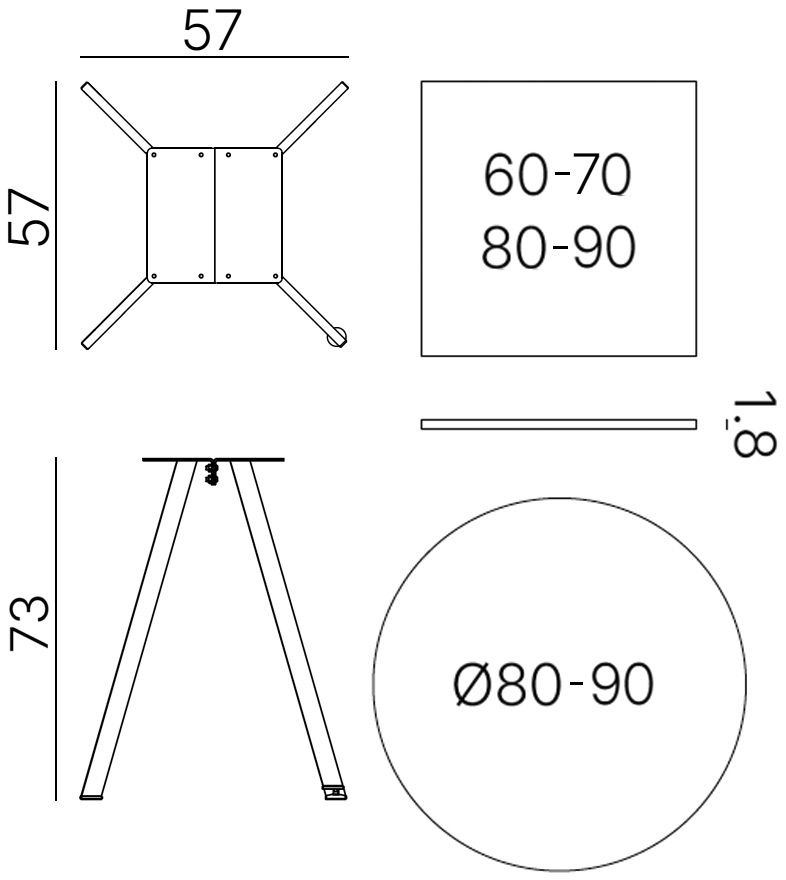 Dimensions plateaux, rond ou carré avec finition chant, arrondie, droit ou incliné sous plateau.