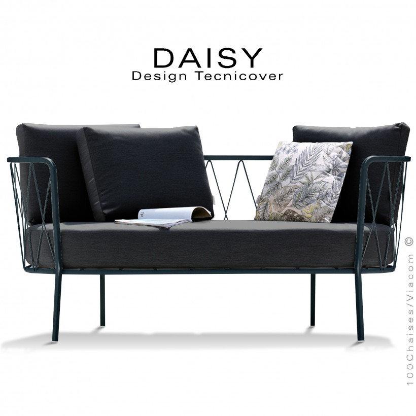 Salon de jardin, canapé lounge, 2 places DAISY, structure acier peint, assise dossier confort avec quatre coussins tissu.