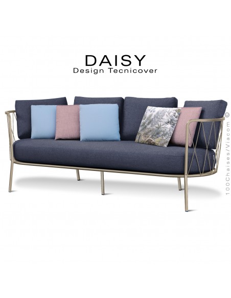 Normes européennesSalon de jardin, sofa, canapé lounge, DAISY, structure tube d'acier 30 mm., avec tampons plastique de protection des sols. Assise 3 places en tôle d'acier ronde, bord arrondi, avec dossier et accoudoirs, jonction treillis en rond ou fils l'acier 8 mm. Finition structure, peinture poudre polyester thermodurcissables, couleur au choix suivant palette fabricant. L'assise est composée de quatre coussins fabriqués dans un tissu de haute qualité, résistant aux rayons U.V., conservant ainsi les couleurs pendant longtemps. L'habillage des coussins est faite dans la gamme de tissu BUSINESS, 100% acrylique. Les coussins sont enduits à l'intérieur d'une couche de PVC, ce qui le rend imperméable, tout en laissant respirer la mousse polyuréthane haute densité intérieur, afin de lutter contre la formation de moisissures - Personnalisable à la demande, autre gamme de tissu à commandes@100chaises.fr